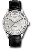 39mm 18K white gold case, flared screw-down crown with Rolex emblem, bezel set with 62 diamonds, domed sapphire crystal, rhodium dial, 18K white gold index hour markers, Rolex calibre 3132 self-winding movement, approximately 48 hours of power reserve, shiny black alligator leather strap, 18K white gold buckle. Waterproof to 50 meters.