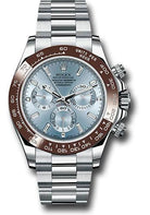 40mm 950 platinum case, screw-down crown and push buttons, chestnut brown monobloc Cerachrom bezel with engraved tachymetric scale deposited with platinum via PVD, ice blue dial, 11 baguette diamond hour markers, Rolex calibre 4130 automatic movement, platinum Oyster bracelet, folding Oysterlock buckle with Easylink 5mm comfort extension link. Waterproof to 100 meters.
