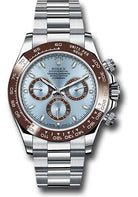 40mm 950 platinum case, chestnut brown monobloc Cerachrom bezel with engraved tachymetric scale deposited with platinum via PVD, screw-down crown and push buttons, ice blue dial with chestnut brown lacquer counters, Chromalight appliques on hands, index hour markers with Chromalight appliques, self-winding perpetual mechanical chronograph movement, folding Oysterlock bracelet with Easylink 5 mm comfort extension. Waterproof to 100 meters.