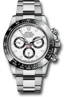 40mm polished 904L stainless steel case, screw-down back and push buttons, screw-down crown and push buttons with Triplock triple waterproofness, black monobloc ceramic Cerachrom bezel with engraved tachymetric scale, scratch-resistant sapphire crystal, white panda lacquer dial, 18K white gold applied applique hour markers with Chromalight, black snailed counters, automatic movement with chronograph central second hand, 30-minute counter at 3 o'clock, and 12-hour counter at 9 o'clock, approximately 72 hours of power reserve, 904L stainless steel Oyster bracelet with solid links, folding Oysterlock buckle with Easylink 5mm comfort extension link. Waterproof to 100 meters. The 116500 series was first introduced at the 2016 Baselworld Watch Fair.