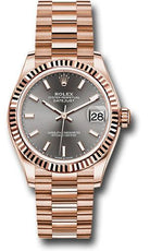 31mm 18K Everose gold case, screw-down crown with twinlock double waterproofness system, fluted bezel, scratch-resistant sapphire crystal with cyclops lens over the date, dark rhodium dial, index hour markers, Rolex calibre 2236 automatic movement with center hour, minute and seconds hands, instantaneous date with rapid setting, and stop-seconds for precise time setting, approximately 55 hours of power reserve, 18K Everose gold President bracelet with semi-circular three-piece links, concealed folding Crownclasp buckle. Waterproof to 100 meters.