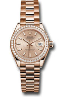 Rolex Everose Gold Lady-Datejust 28 Watch - 44 Diamond Bezel - Pink Sundust Index Dial - President Bracelet - 279135RBR pip