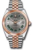 41mm Everose Rolesor case with 904L steel monobloc middle case, screw-down steel back, 18K Everose gold screw-down crown, 18K Everose gold smooth bezel, scratch-resistant double anti-reflective sapphire crystal with cyclops lens over the date, slate gray dial, green Roman numerals, Rolex calibre 3235 perpetual self-winding movement with date at 3 o'clock that changes instantaneously at midnight in a few thousandths of a second, approximately 70 hours of power reserve, Everose Rolesor Jubilee bracelet made from a combination of 904L steel and 18K Everose gold with five-piece links, folding Oysterclasp buckle with Easylink 5mm comfort extension link. Waterproof to 100 meters.