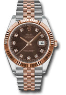 41mm Everose Rolesor case with 904L steel monobloc middle case, screw-down steel back, 18K Everose gold screw-down crown, 18K Everose gold fluted bezel, scratch-resistant double anti-reflective sapphire crystal with cyclops lens over the date, chocolate dial, diamond hour markers, Rolex calibre 3235 perpetual self-winding movement with date at 3 o'clock that changes instantaneously at midnight in a few thousandths of a second, approximately 70 hours of power reserve, Everose Rolesor Jubilee bracelet made from a combination of 904L steel and 18K Everose gold with five-piece links, folding Oysterclasp buckle with Easylink 5mm comfort extension link. Waterproof to 100 meters.