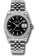 36mm stainless steel case, 18K white gold bezel set with 52 brilliant-cut diamonds, black dial, index hour markers, and stainless steel Jubilee bracelet.