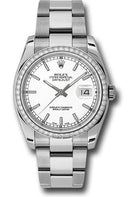 36mm stainless steel case, 18K white gold bezel set with 52 brilliant-cut diamonds, white dial, index hour markers, and stainless steel Oyster bracelet.