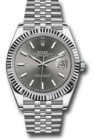 41mm white Rolesor case comprised of a 904L steel monobloc middle case, screw-down steel back, screw-down crown with twinlock double waterproofness system, 18K white gold fluted bezel, scratch-resistant double anti-reflective sapphire crystal with cyclops lens over the date, dark rhodium dial, index hour markers, Rolex calibre 3235 perpetual self-winding movement with date at 3 o'clock that changes instantaneously at midnight in a few thousandths of a second, approximately 70 hours of power reserve, 904L steel Jubilee bracelet with five-piece links, folding Oysterclasp buckle with Easylink 5mm comfort extension link. Waterproof to 100 meters.