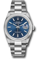 36mm Oystersteel case, screw-down steel back, screw-down crown with twinlock double waterproofness system, domed bezel, scratch-resistant sapphire crystal with cyclops lens over the date, blue dial, index hour markers, Rolex calibre 3235 perpetual self-winding movement with center hour, minute and seconds hands, instantaneous date at 3 o'clock with rapid setting, and stop-seconds for precise time setting, approximately 70 hours of power reserve, Oyster bracelet with flat three-piece links, folding Oysterclasp buckle with Easylink 5mm comfort extension link. Waterproof to 100 meters. Baselworld 2019 release.