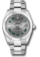 41mm 904L stainless steel case, screw-down steel back, screw-down crown with twinlock double waterproofness system, smooth bezel, scratch-resistant double anti-reflective sapphire crystal with cyclops lens over the date, slate dial, green Roman numerals, Rolex calibre 3235 perpetual self-winding movement with date at 3 o'clock that changes instantaneously at midnight in a few thousandths of a second, approximately 70 hours of power reserve, 904L steel Oyster bracelet with flat three-piece links, folding Oysterclasp buckle with Easylink 5mm comfort extension link. Waterproof to 100 meters.