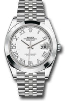 41mm 904L stainless steel case, screw-down steel back, screw-down crown with twinlock double waterproofness system, smooth bezel, scratch-resistant double anti-reflective sapphire crystal with cyclops lens over the date, white dial, Roman numerals, Rolex calibre 3235 perpetual self-winding movement with date at 3 o'clock that changes instantaneously at midnight in a few thousandths of a second, approximately 70 hours of power reserve, 904L steel Jubilee bracelet with five-piece links, folding Oysterclasp buckle with Easylink 5mm comfort extension link. Waterproof to 100 meters.