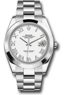 41mm 904L stainless steel case, screw-down steel back, screw-down crown with twinlock double waterproofness system, smooth bezel, scratch-resistant double anti-reflective sapphire crystal with cyclops lens over the date, white dial, Roman numerals, Rolex calibre 3235 perpetual self-winding movement with date at 3 o'clock that changes instantaneously at midnight in a few thousandths of a second, approximately 70 hours of power reserve, 904L steel Oyster bracelet with flat three-piece links, folding Oysterclasp buckle with Easylink 5mm comfort extension link. Waterproof to 100 meters.