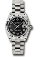 Rolex White Gold Datejust 31 Watch - Fluted Bezel - Black Concentric Circles Arabic Dial - President Bracelet - 178279 bkcap