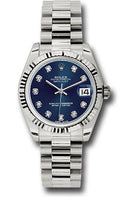 Rolex White Gold Datejust 31 Watch - Fluted Bezel - Blue Diamond Dial - President Bracelet - 178279 bldp