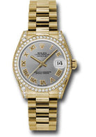 31mm 18K yellow gold case, bezel set with 48 diamonds, case lugs set with 24 diamonds, gray dial, Roman numerals, and President bracelet.