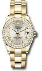 31mm 18K yellow gold case, screw-down crown with twinlock double waterproofness system, bezel set with 46 diamonds, scratch-resistant sapphire crystal with cyclops lens over the date, silver diamond Roman IV dial, Roman numerals with 11 diamonds set on VI, Rolex calibre 2236 automatic movement with center hour, minute and seconds hands, instantaneous date with rapid setting, and stop-seconds for precise time setting, approximately 55 hours of power reserve, 18K yellow gold Oyster bracelet with flat three-piece links, concealed folding Crownclasp buckle. Waterproof to 100 meters.