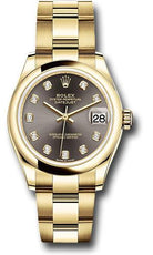 31mm 18K yellow gold case, screw-down crown with twinlock double waterproofness system, domed bezel, scratch-resistant sapphire crystal with cyclops lens over the date, dark grey dial, 10 diamond hour markers, Rolex calibre 2236 automatic movement with center hour, minute and seconds hands, instantaneous date with rapid setting, and stop-seconds for precise time setting, approximately 55 hours of power reserve, 18K yellow gold Oyster bracelet with flat three-piece links, concealed folding Crownclasp buckle. Waterproof to 100 meters.