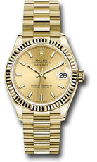 31mm 18K yellow gold case, screw-down crown with twinlock double waterproofness system, fluted bezel, scratch-resistant sapphire crystal with cyclops lens over the date, champagne dial, index hour markers, Rolex calibre 2236 automatic movement with center hour, minute and seconds hands, instantaneous date with rapid setting, and stop-seconds for precise time setting, approximately 55 hours of power reserve, 18K yellow gold President bracelet with semi-circular three-piece links, concealed folding Crownclasp buckle. Waterproof to 100 meters.