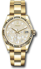 31mm 18K yellow gold case, screw-down crown with twinlock double waterproofness system, fluted bezel, scratch-resistant sapphire crystal with cyclops lens over the date and double anti-reflective coating, diamond paved mother-of-pearl butterfly dial, Rolex calibre 2236 automatic movement with center hour, minute and seconds hands, instantaneous date with rapid setting, and stop-seconds for precise time setting, approximately 55 hours of power reserve, 18K yellow gold Oyster bracelet with flat three-piece links, concealed folding Crownclasp buckle. Waterproof to 100 meters.