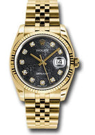 36mm 18K yellow gold case, screw-down crown, 18K yellow gold fluted bezel, scratch-resistant sapphire crystal with cyclops lens over the date, black Jubilee dial, diamond hour markers, Rolex calibre 3135 automatic movement, approximately 48 hours of power reserve, 18K yellow gold Jubilee bracelet with five-piece links, concealed folding Crownclasp buckle. Waterproof to 100 meters.