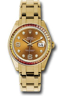 39mm 18K yellow gold case, screw-down back, screw-down crown with twinlock double waterproofness system, bezel set with 48 orange to yellow gradient baguette-cut sapphires, scratch-resistant sapphire crystal with cyclops lens over the date, cognac dial, 8 diamond hour markers, Arabic 6 and 9 set with 32 diamonds, Rolex calibre 3235 automatic movement, Datejust Pearlmaster bracelet with rounded five-piece links. Waterproof to 100 meters.