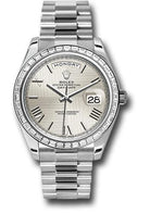 40mm 950 platinum case, screw-down back with Rolex fluting, screw-down crown with twinlock double waterproofness system, bezel set with 40 baguette-cut diamonds, scratch-resistant double anti-reflective sapphire crystal with cyclops lens over the date, silver quadrant motif dial, bevelled deconstructed Roman numerals, Rolex calibre 3255 automatic movement with centre hour, minute and seconds hands, instantaneous day and date in apertures, unrestricted rapid-setting, and stop-seconds for precise time setting, approximately 70 hours of power reserve, President bracelet with three-piece solid links comprised of a polished center link, satin-finished outer links, and ceramic inserts, concealed folding Crownclasp buckle. Waterproof to 100 meters.