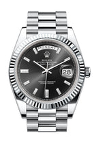 The Rolex Day-Date 40 Bright Black Dial with 10 Baguette-Cut Diamonds, set within a Fluted Bezel Platinum President Men's Watch, embodies sophistication, artistry, and an unwavering dedication to excellence in watchmaking.