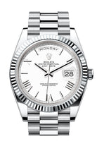 Adorned with the esteemed Swiss Made label, the Rolex Day-Date 40 in Platinum with a White Dial and Fluted Bezel stands as a timeless symbol of refinement, craftsmanship, and enduring sophistication.