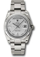 36mm 18K white gold case, fluted bezel, meteorite dial, 2 diamond hour markers and Arabic numerals, and Oyster bracelet.