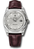 Rolex White Gold Day-Date 36 Watch - Fluted Bezel - Silver Index Dial - Brown Leather - 118139 sibr