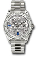 40mm 18K white gold case, screw-down back with Rolex fluting, screw-down crown with twinlock double waterproofness system, 18K white gold bezel set with 48 diamonds, scratch-resistant double anti-reflective sapphire crystal with cyclops lens over the date, diamond paved dial, 8 baguette-cut diamond hour markers and 2 baguette-cut sapphires, Rolex calibre 3255 automatic movement with centre hour, minute and seconds hands, instantaneous day and date in apertures, unrestricted rapid-setting, and stop-seconds for precise time setting, approximately 70 hours of power reserve, President bracelet with three-piece solid links comprised of a polished center link, satin-finished outer links, and ceramic inserts, concealed folding Crownclasp buckle. Waterproof to 100 meters.