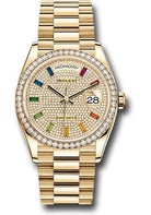 Rolex Yellow Gold Day-Date 36 Watch - Diamond Bezel - Diamond-Paved Rainbow Sapphire Dial - President Bracelet - 128348RBR dprsp