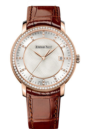 Audemars Piguet Jules Audemars Extra-Thin 41mm Silver Index Diamond Bezel Rose Gold Leather | 15182OR.ZZ.A102CR.01