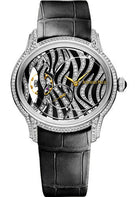 39.5 mm 18K white gold case entirely set with brilliant-cut diamonds, 9.8 mm thick, glareproofed sapphire crystal back, crown set with an onyx cabochon, glareproofed sapphire crystal, dial with 18K white gold off-centred disc and small seconds counter with zebra” pattern, set with brilliant-cut diamonds and onyx, yellow gold hands, Manufacture 5205 hand-wound movement with hours, minutes, small seconds, approximately 49 hours of power reserve, large square scale black alligator strap and additional black shiny strap, diamond-set 18K white gold pin buckle. Water resistant to 20 meters.