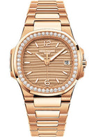 32 mm 18K rose gold case set with 46 diamonds (~0.73 ct.), golden dial with luminescent applied gold hour markers, caliber E23-250 S C quartz movement with date and sweep seconds, 18K rose gold bracelet, Nautilus fold-over buckle. Water resistant to 60 m.