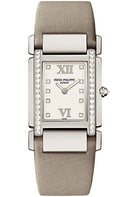 25mm x 30mm 18K white gold case set with 34 diamonds (~0.66 ct.), diamond set crown, timeless white dial with diamond hour markers and gold applied Roman numerals, quartz caliber E 15 movement, one black satin strap and one pearl gray satin strap. Water resistant to 30 meters.