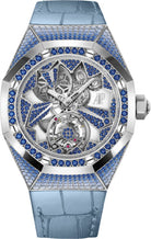 | CASE DETAIL | 18-carat white gold case set with brilliant-cut graded blue sapphires, bezel set with brilliant-cut blue sapphires, glareproofed sapphire crystal and caseback, crown set with a translucent sapphire cabochon |