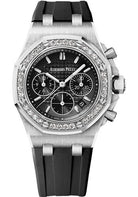 37mm stainless steel case, 11.8mm thick, screw-locked crown, bezel set with with 32 brilliant-cut diamonds (~1.02 carats), glareproofed sapphire crystal, black dial with new “Lady Tapisserie” pattern, circular-grained external zone, pink gold applied hour-markers and Royal Oak hands with luminescent coating, caliber 2385 self-winding movement with chronograph, hours, minutes, small seconds, date, approximately 40 hours of power reserve, black rubber strap, AP folding buckle. Water resistant to 50 meters.