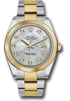 41mm Yellow Rolesor case with 904L steel monobloc middle case, screw-down steel back, 18K yellow gold screw-down crown, 18K yellow gold smooth bezel, scratch-resistant double anti-reflective sapphire crystal with cyclops lens over the date, mother-of-pearl dial, diamond hour markers, Rolex calibre 3235 perpetual self-winding movement with date at 3 o'clock that changes instantaneously at midnight in a few thousandths of a second, approximately 70 hours of power reserve, yellow Rolesor Oyster bracelet made from a combination of 904L steel and 18K yellow gold with flat three-piece links, folding Oysterclasp buckle with Easylink 5mm comfort extension link. Waterproof to 100 meters.